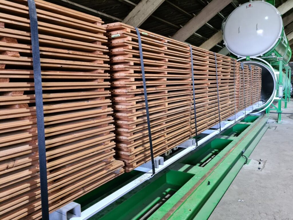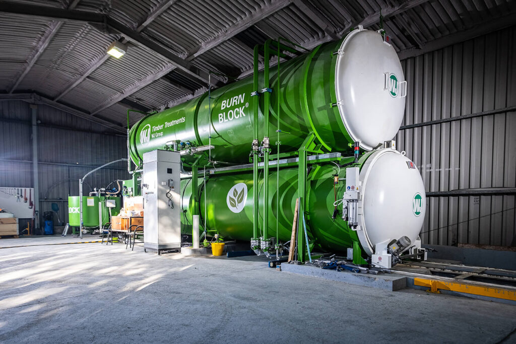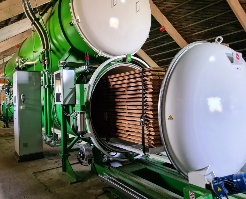 Seatud eesmärgi saavutamiseks oleme investeerinud uude kaasaegsesse surveseadmesse, mis võimaldab immutada erinevatest puiduliikidest ning töötlustasemel tooteid. Meie kasutatav BURNBLOCK tuleaeglusti on 100% looduslik, biolagunev, pH-neutraalne, mittesöövitav ning millele on omistatud Cradle to Cradle Certified™ kuld-taseme sertifikaat.